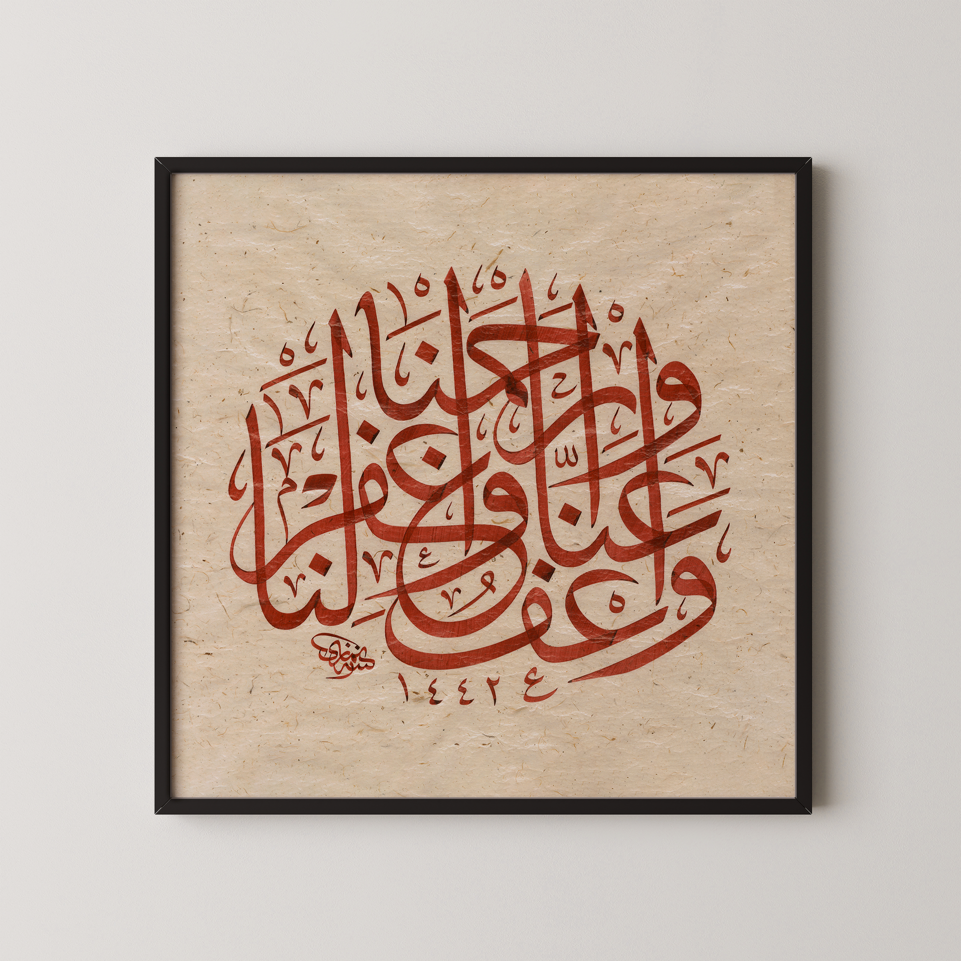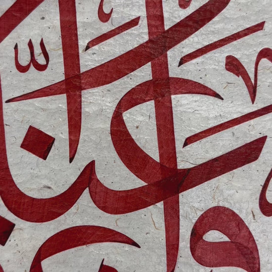 From the final verse of Surah al-Baqarah, this calligraphy carries three profound invocations: wa‘fu ʿannā, waghfir lanā, warḥamnā: pardon us, forgive us, and have mercy on us. The words are written in Jalī Thuluth, a monumental script first refined in the 9th–10th centuries and later perfected under the Ottomans, celebrated for its sweeping curves and commanding elegance. They are arranged in an istif, a carefully balanced composition developed in the Ottoman calligraphic tradition, where letters interlace like architecture in ink. Rendered eventually in a deep crimson hue, the piece came together over the course of several months, a process of devotion as much as artistry, resulting in a work that unites prayer, history, and beauty.