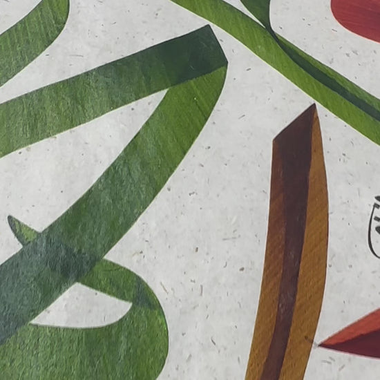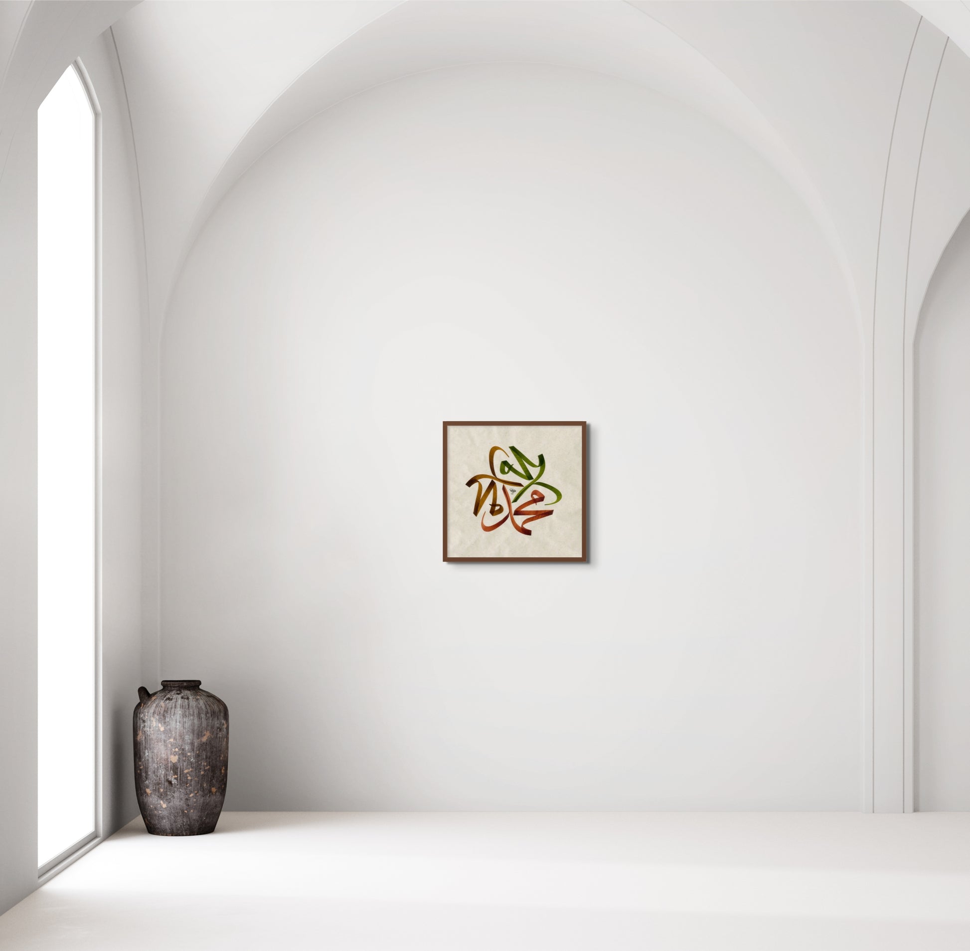 Rendered in warm ochres, deep cinnabar reds, and green hues reminiscent of palm fronds after rain, the composition draws the viewer into that circle. The script flows in a continuous motion, without beginning or end, a reflection of his timeless presence and enduring light.