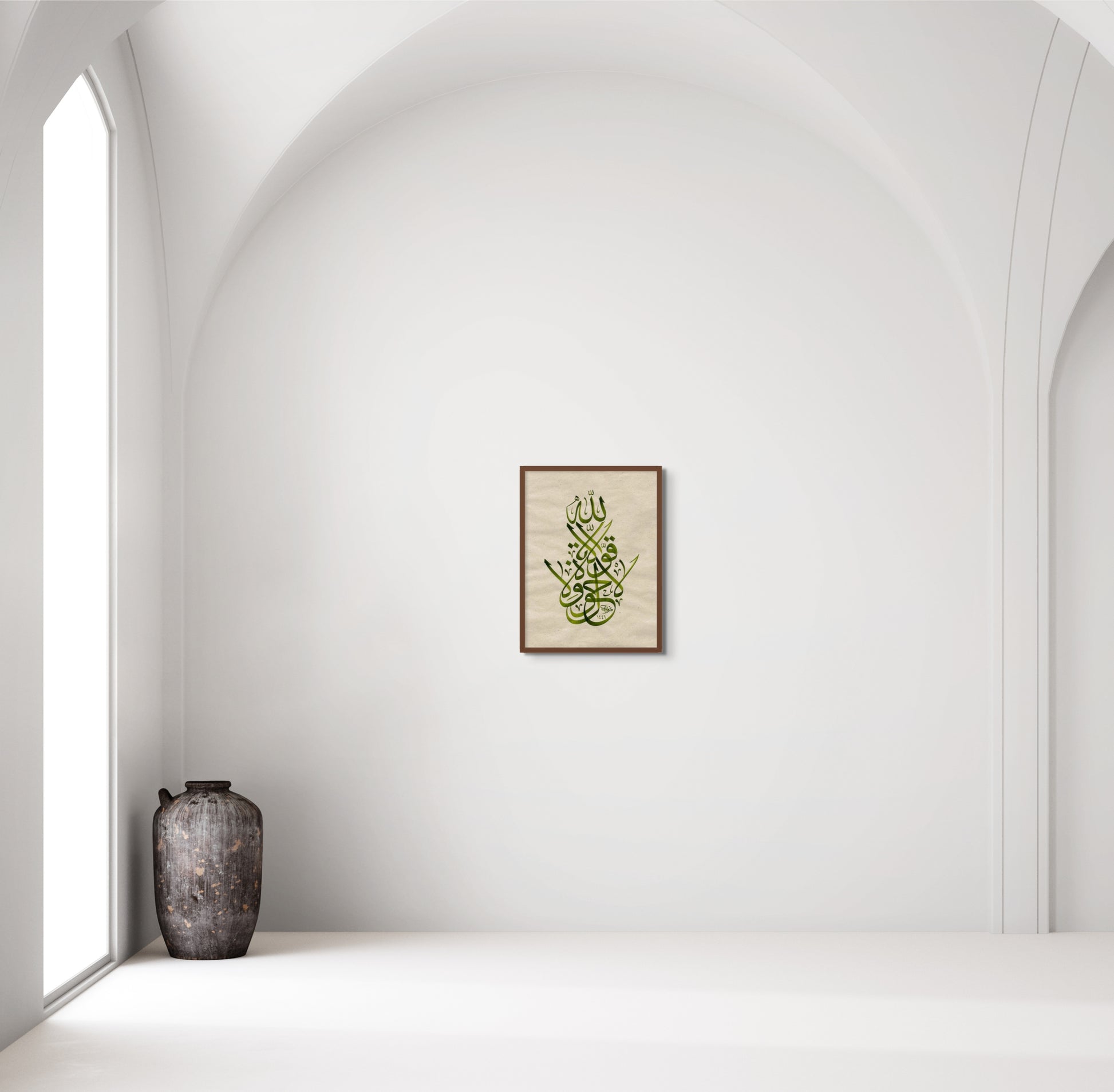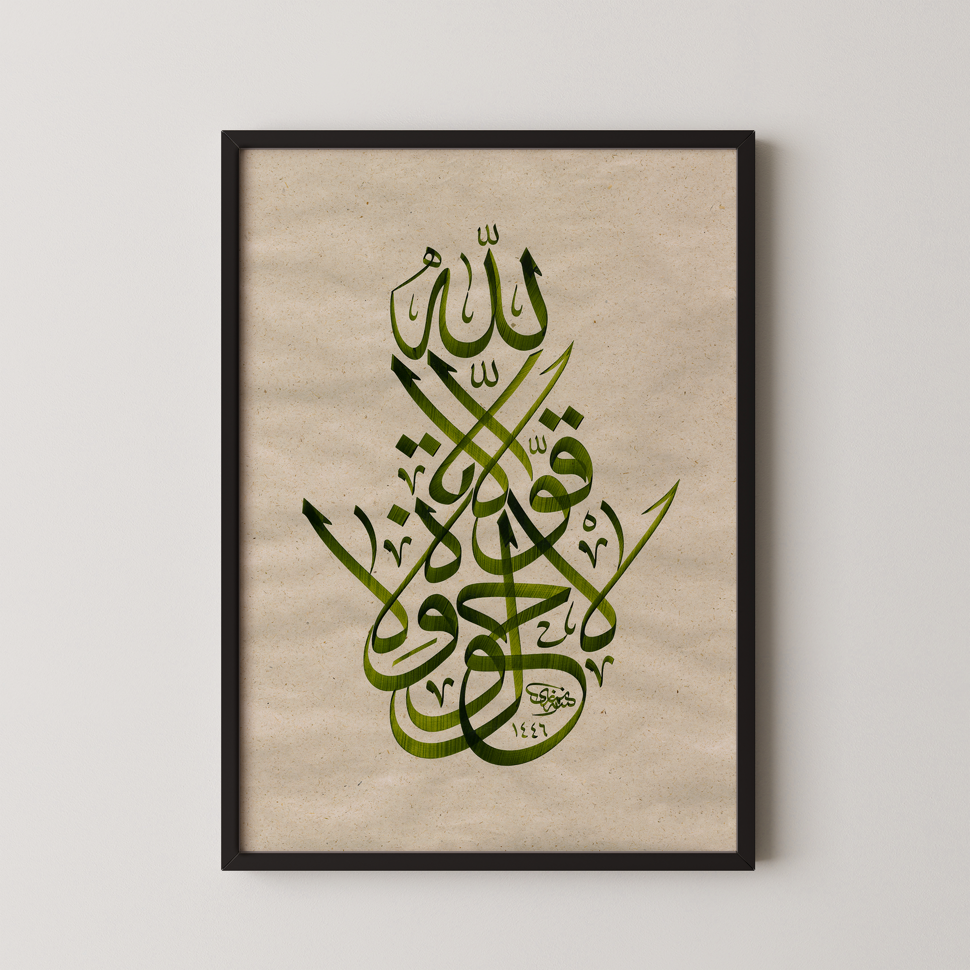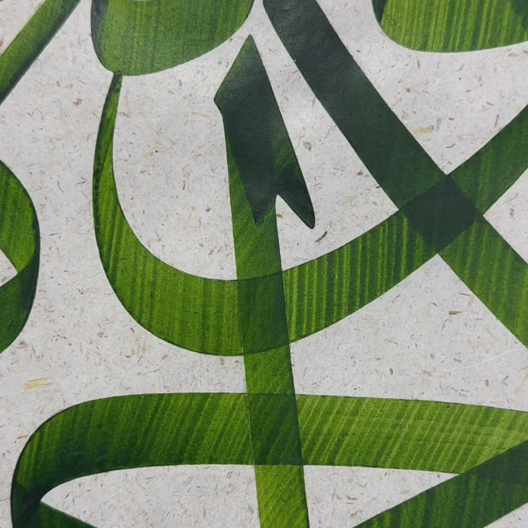 Set in deep green tones, the composition draws from the Jalī Thuluth script, its bold confident strokes balanced by spacious pauses that echo composure and trust. The negations (lā) dominate the structure, their assertive upward curves forming the visual backbone of the piece. These denials are not voids but affirmations, a rhythm of “not this, not that,” leading the eye and heart toward the One beyond all power.
